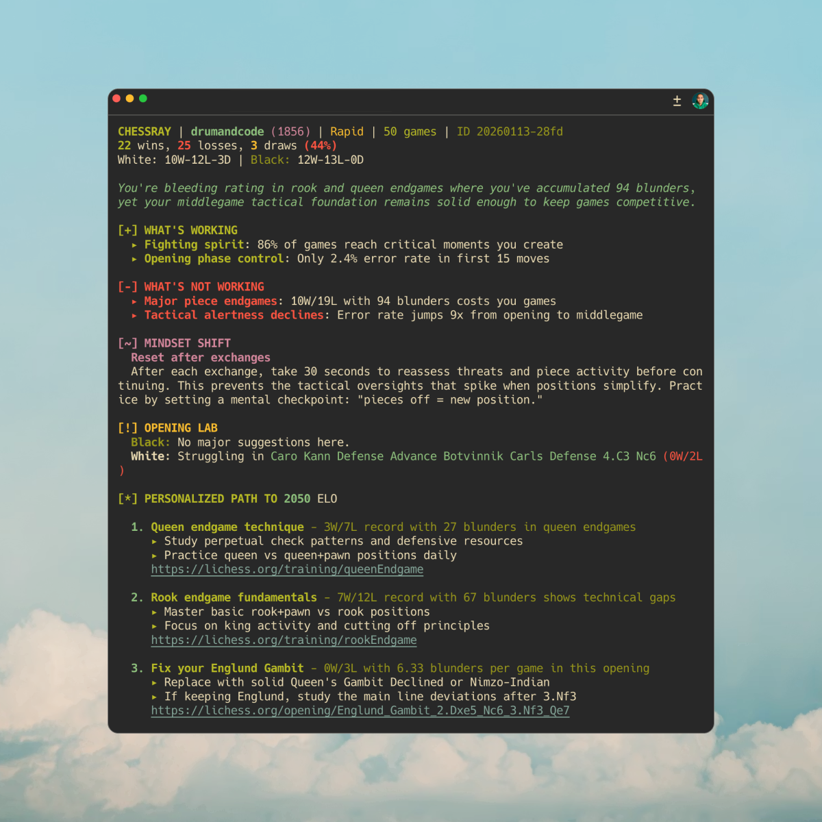 The first report was mind-blowing. The analysis was painfully accurate ("practice rook endgame fundamentals" 🥲), and it felt like magic. It unlocked patterns that I had been missing for months. I learned why I've been stuck, and what to spend time on. It felt having a WHOOP, but for chess.
